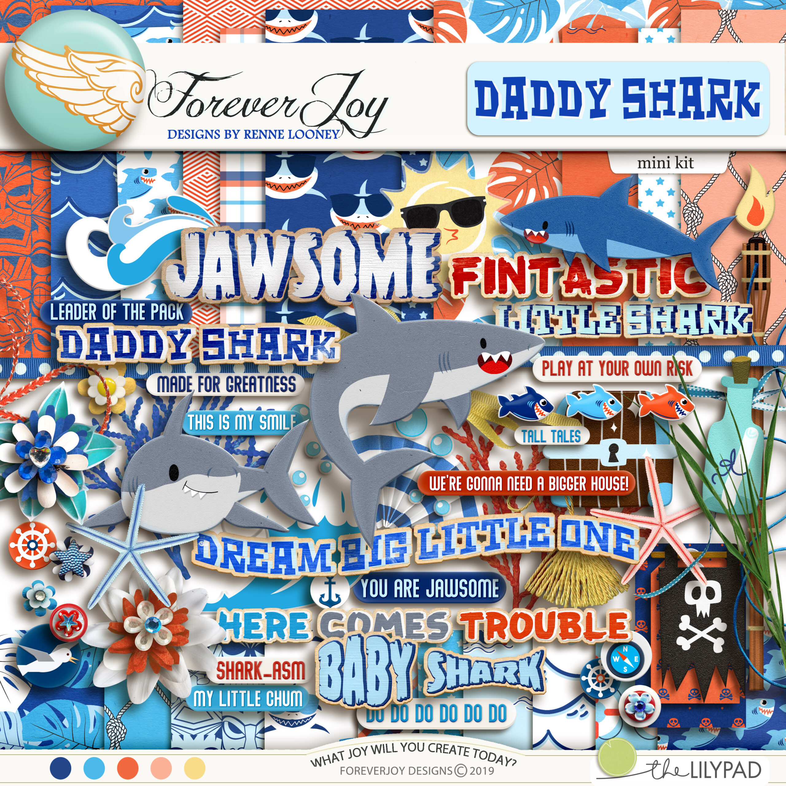 Daddy Shark isn’t just for Father’s Day — it’s for telling the story of the splash-making, cannonball-jumping, fish-story-spinning guys who bring big energy and even bigger heart to your memories. Whether it’s beach days, aquarium trips, or fishing trips or just days with dads, this kit helps you capture the moments where love shows up loud, goofy, sun-soaked, and sometimes with a snorkel on. Use it to document the dad who always shows up, the uncle who never says no to one more swim, or the kid at heart who keeps the fun going long after the tide rolls out. Bold, playful, and full of heart — this one’s for the guys who make waves.