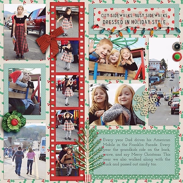 This layout of an annual Christmas parade captures the sights and excitement of it all- the outfits, the excitement and wonder- that’s what make the layout matter- not the exact date it happened!